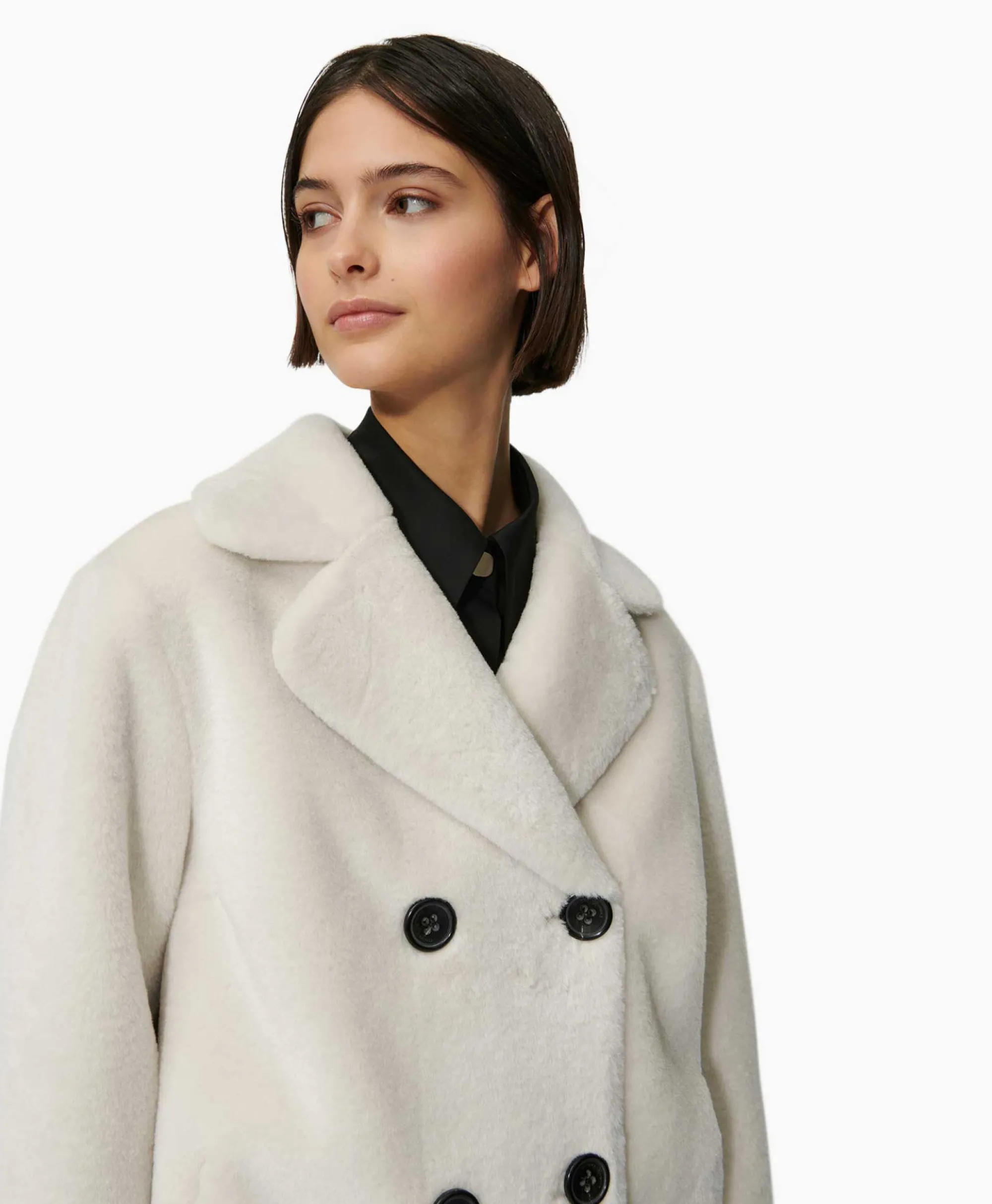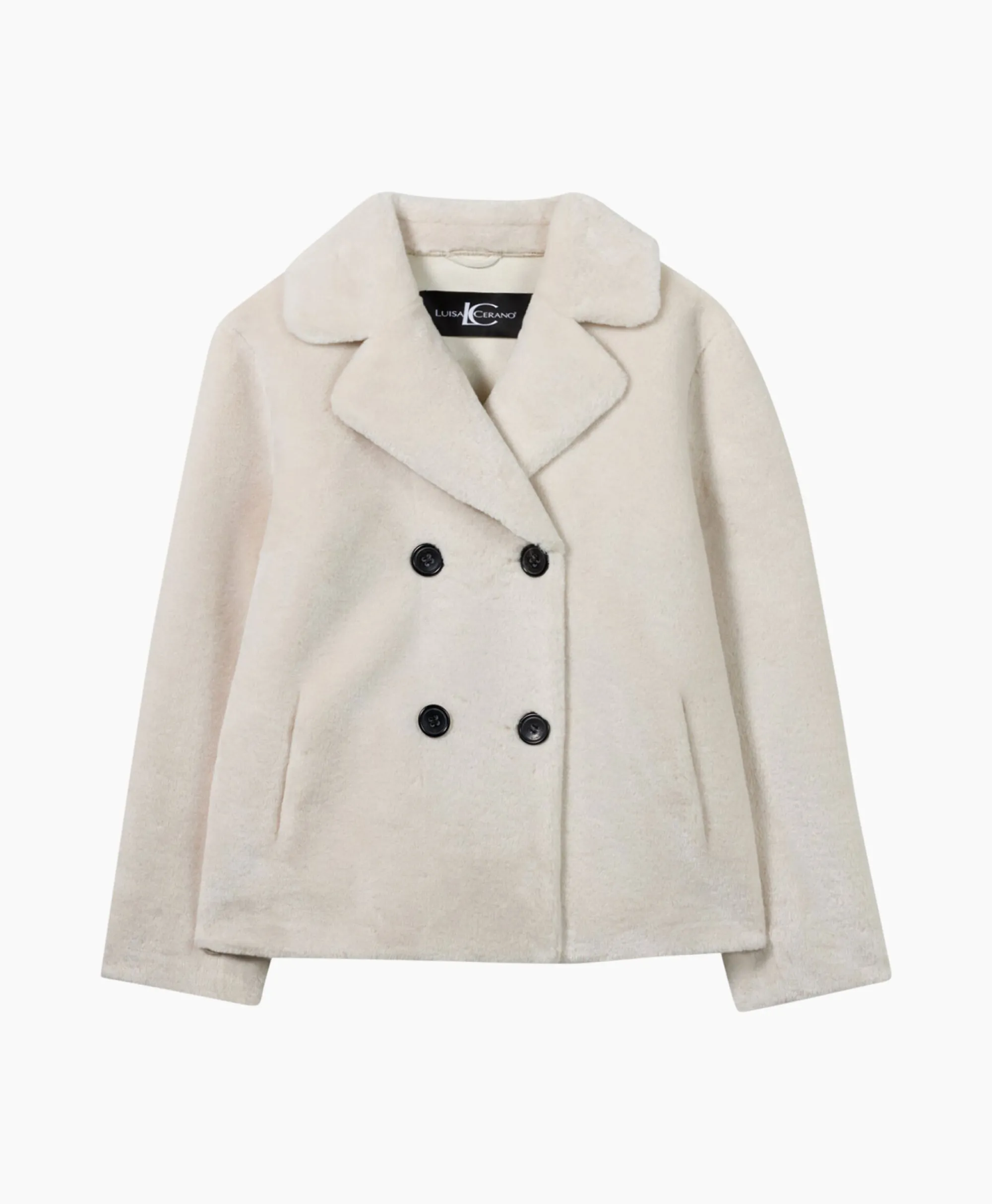 Iets Uitlopend Jasje In Lamsvachtlook Met Bijpassende Kleur Aan De Achterkant En Reverskraag. Dit Jasje In Caban-Stijl Met Dubbele Rij Knopen Heeft Echte Hoornen Knopen In Een Contrasterende Kleur En Twee Steekzakken. Het Model Is 178 Cm Lang En Draagt Maat 36.&Nbsp;