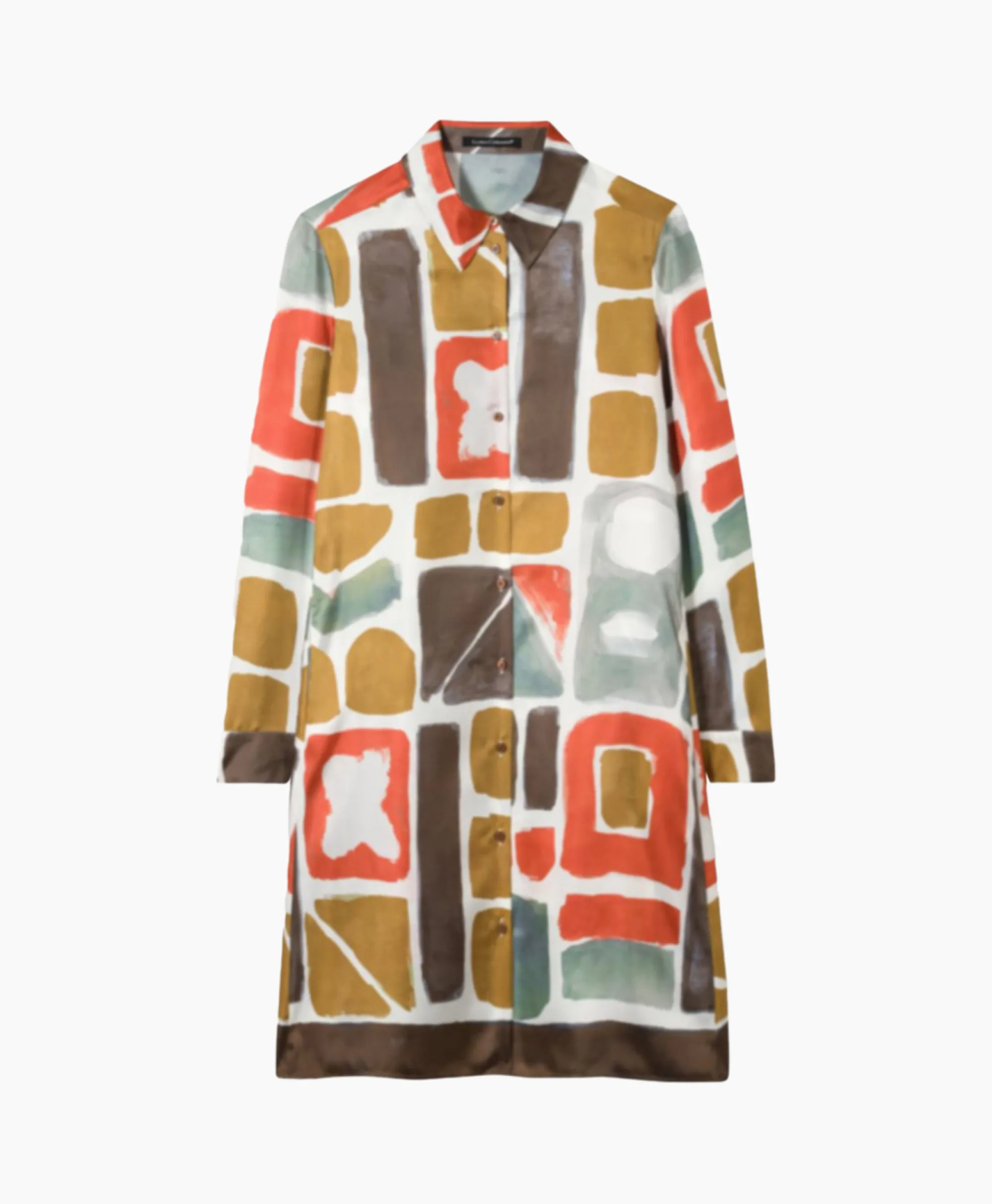 Ruimvallende, Licht Uitlopende Overhemdjurk Met Exclusieve All-Over Print In Etnische Stijl. De Jurk Is Gemaakt Van Licht, Zomers Zijdesatijn En Heeft Glanzende Parelmoeren Knopen.&Nbsp;Ons Model Is 178 Cm Lang En Draagt Maat 36.