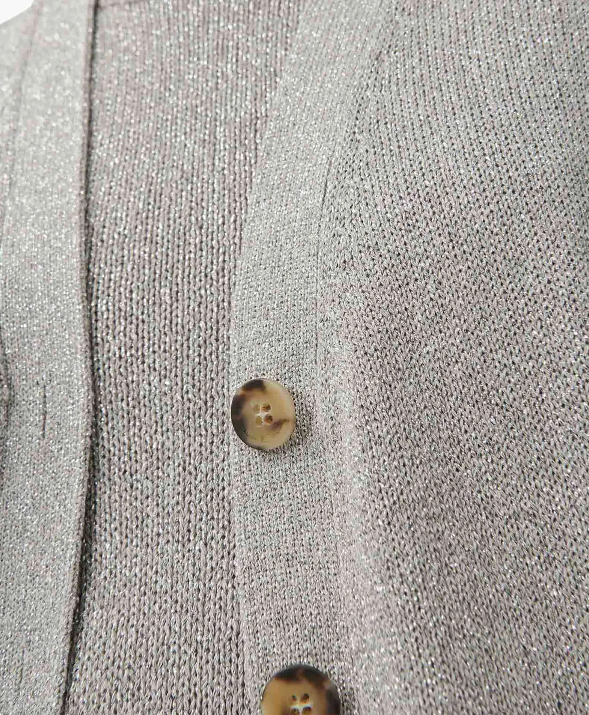 Casual Vest In Een Cropped Model Gemaakt Met Glamoureus, Glinsterend Bandgaren. Geribbelde Details En Een Knoopsluiting Aan De Voorkant Maken Het Ontwerp Compleet. Het Model Is 178 Cm Lang En Draagt Maat 36. Materiaal: 80% Viscose En 20% Polyester