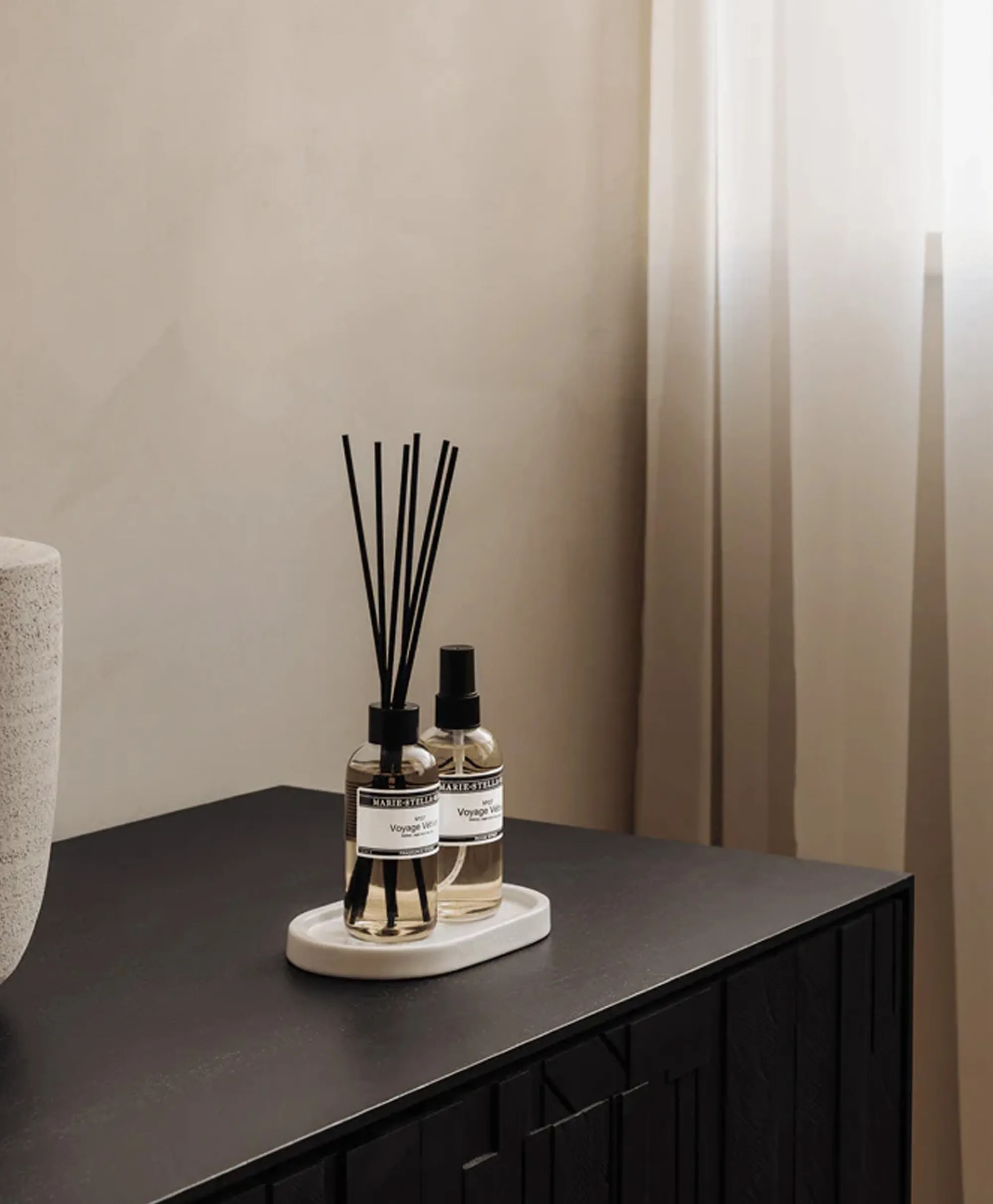 Een Home Set Met Stijlvolle Presenteer Tray Van Keramiek, Voor Een Nog Luxere Uitstraling. Het Perfecte Duo Om Kleinere Ruimtes Continue Subtiel Te Parfumeren En Een Instant Geurboost Te Creëren Wanneer Gewenst. Geniet Van De Geurstokjes En Roomspray In De Verslavende Fris-Schone Geur Met Tonen Van Vetiver, Salie En Zeezout. Brengt Rust En Ontspanning, Zoals Een Wandeling Op Het Strand. Fris Minerale Geur Met Tonen Van Vetiver, Salie En Zeezoutde Set Bestaat Uit: Geurstokjes Voyage Vétiver 100 Ml, Roomspray Voyage Vétiver 100 Ml En Luxe Keramieken Presentatie-Tray