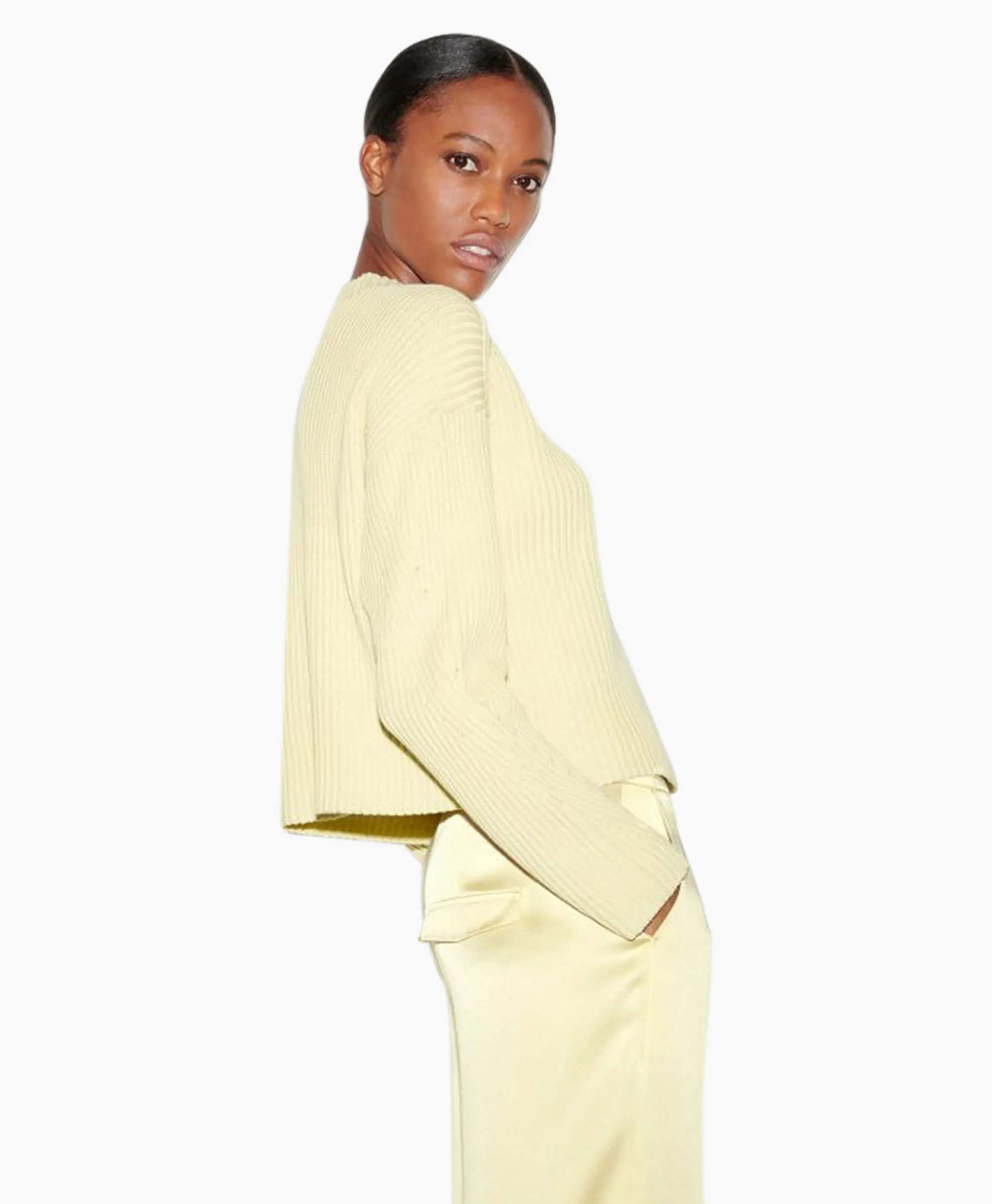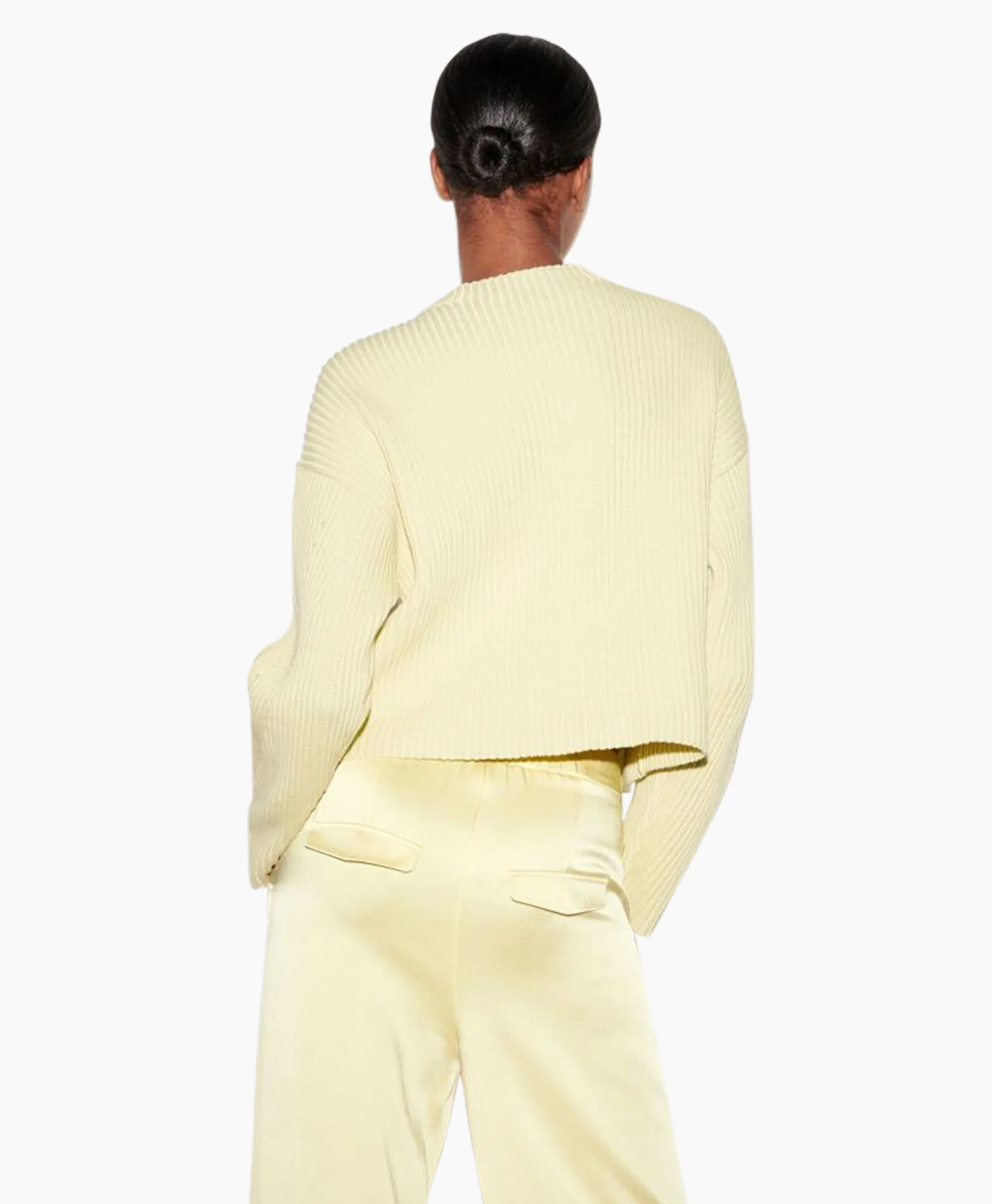Pullover Met Ronde Hals En Verkort Model. Het Geribde Breipatroon Van Zomers Katoengaren Loopt In Verschillende Richtingen En Geeft Deze Pullover Een Opvallende Uitstraling. Ons Model Is 178 Cm Lang En Draagt Maat 36. Materiaal: 100% Katoen.