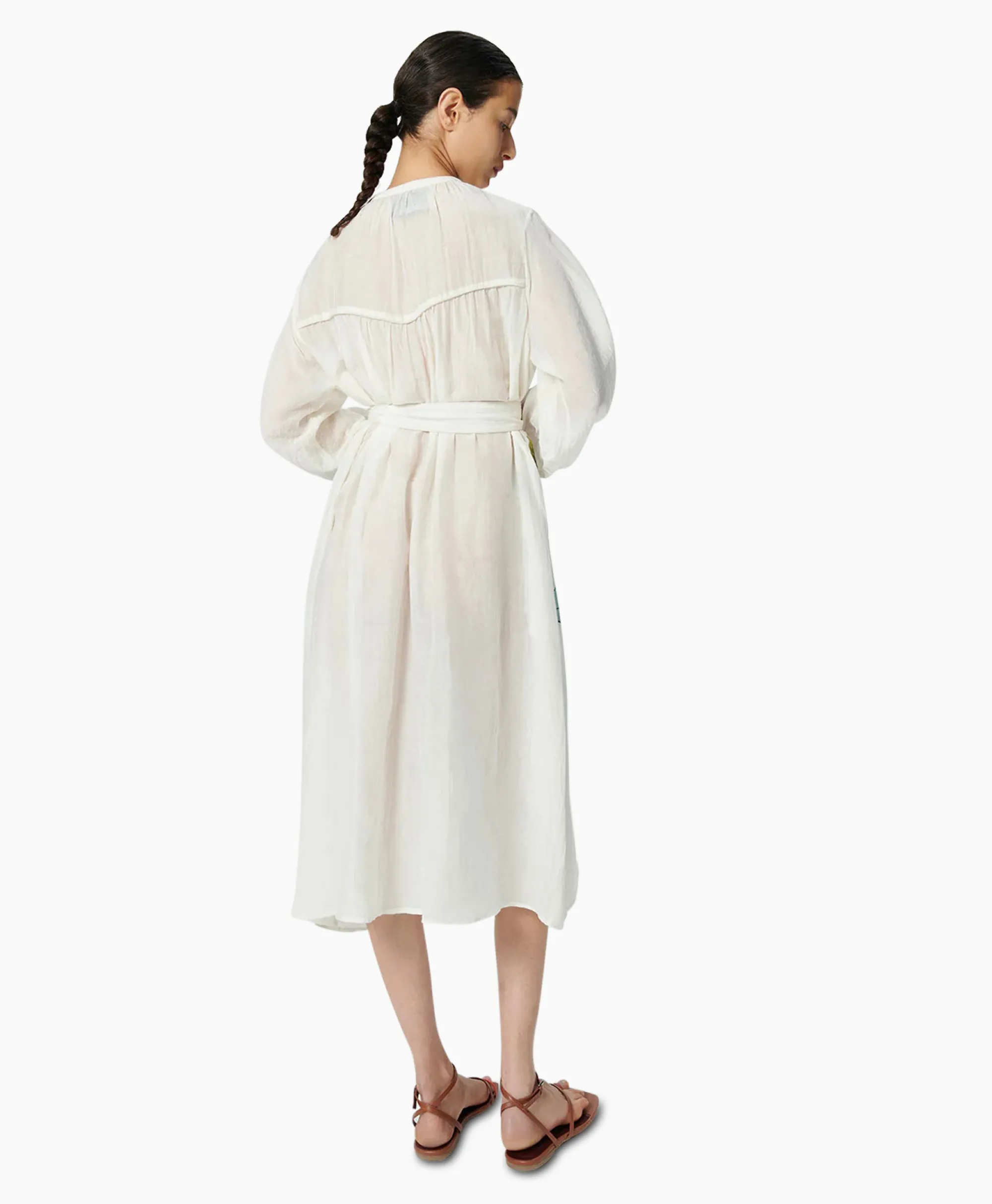 De Met Madeliefjes Geborduurde Maxi-Jurk Is Gemaakt Van Katoenzijdevoile En Heeft Een Ronde Halslijn Met Een Split Aan De Voorkant En Een Knoop; Lange Vloeiende Mouwen; En Biezen Over De Borst, Schouders En Manchetten. De Voorkant Is Voorzien Van Een Gedrukte Lotusbloem, Kolibrie En Vlinder, Versierd Met Handborduurwerk En Kralen. Dit Kledingstuk Kan In De Taille Worden Gestrikt Met Een Afneembare Riem Of Los Gedragen Als Een Kaftan. Perfect Voor Avonden En Speciale Gelegenheden: Style Deze Elegante Jurk Met Hakken Met Bandjes.&Nbsp;
