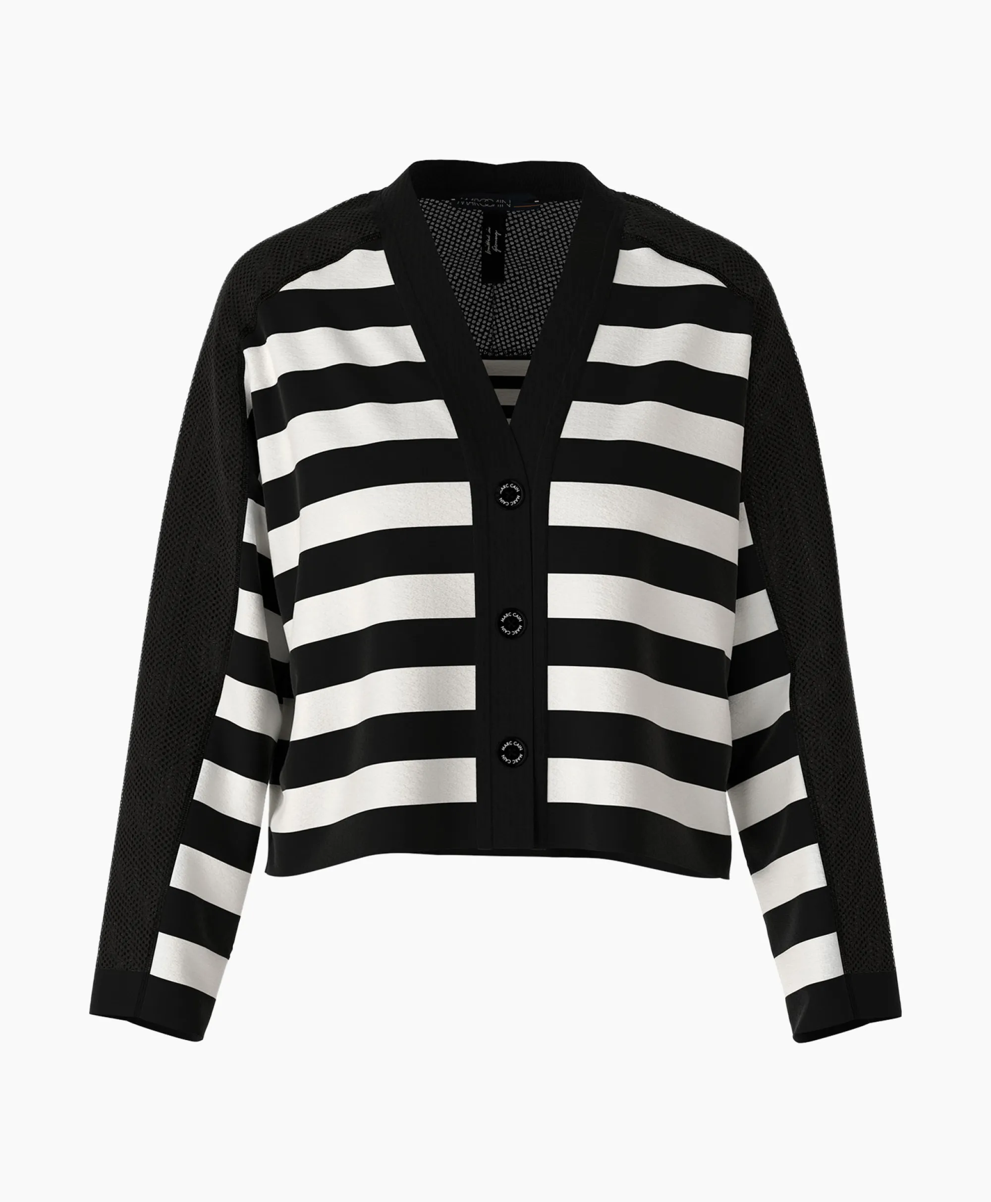 De Cardigan Is Van Een Zachte Vezelmix. De Voorkant Is In Blokstreep Gehouden, Op De Rug Is De Breedte Van De Strepen Gevarieerd. Schouders En Mouwen Zijn Met Inzetstukken Van Mesh Geaccentueerd. Het Model Draagt Het Duurzaamheidslabel ʽRethink Togetherʼ. Bovendien Is Het Knitted In Germany: Het Wordt In Duitsland Met Ultramoderne Technologieën Gebreid En Veredeld. De Afzonderlijke Delen – Zoals Rug- En Voorpand Etc. – Worden In Europese Partnerbedrijven Aan Elkaar Genaaid. Het Model Is 179 Cm Lang En Draagt Maat N3 / 38. Materiaal: 82% Katoen, 18% Polyamide, 100% Polyester, 70% Viscose, 30% Polyester.