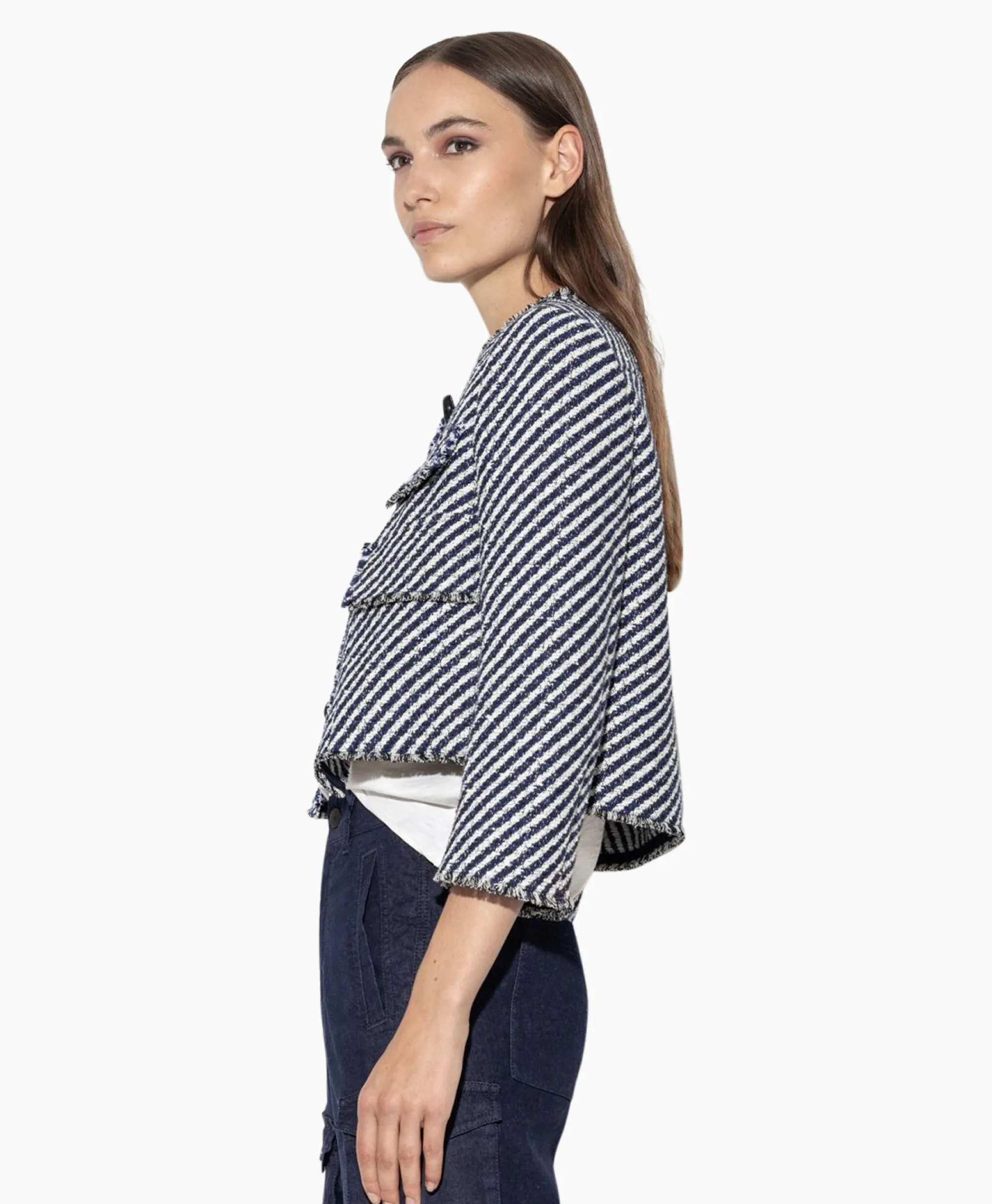Ongevoerd Cropped Jack Van Sportief Katoen Met Tweekleurig Diagonaal Streeppatroon. Het Tweed-Model Met Onafgewerkte Randen Wordt Afgerond Met Een Knoopsluiting, Zijzakken En Decoratieve Borstzakken. Ons Model Is 178 Cm Lang En Draagt Maat 36. Materiaal: 77% Katoen, 9% Polyacryl, 8% Linnen, 5% Andere Vezels, 1% Polyamide.